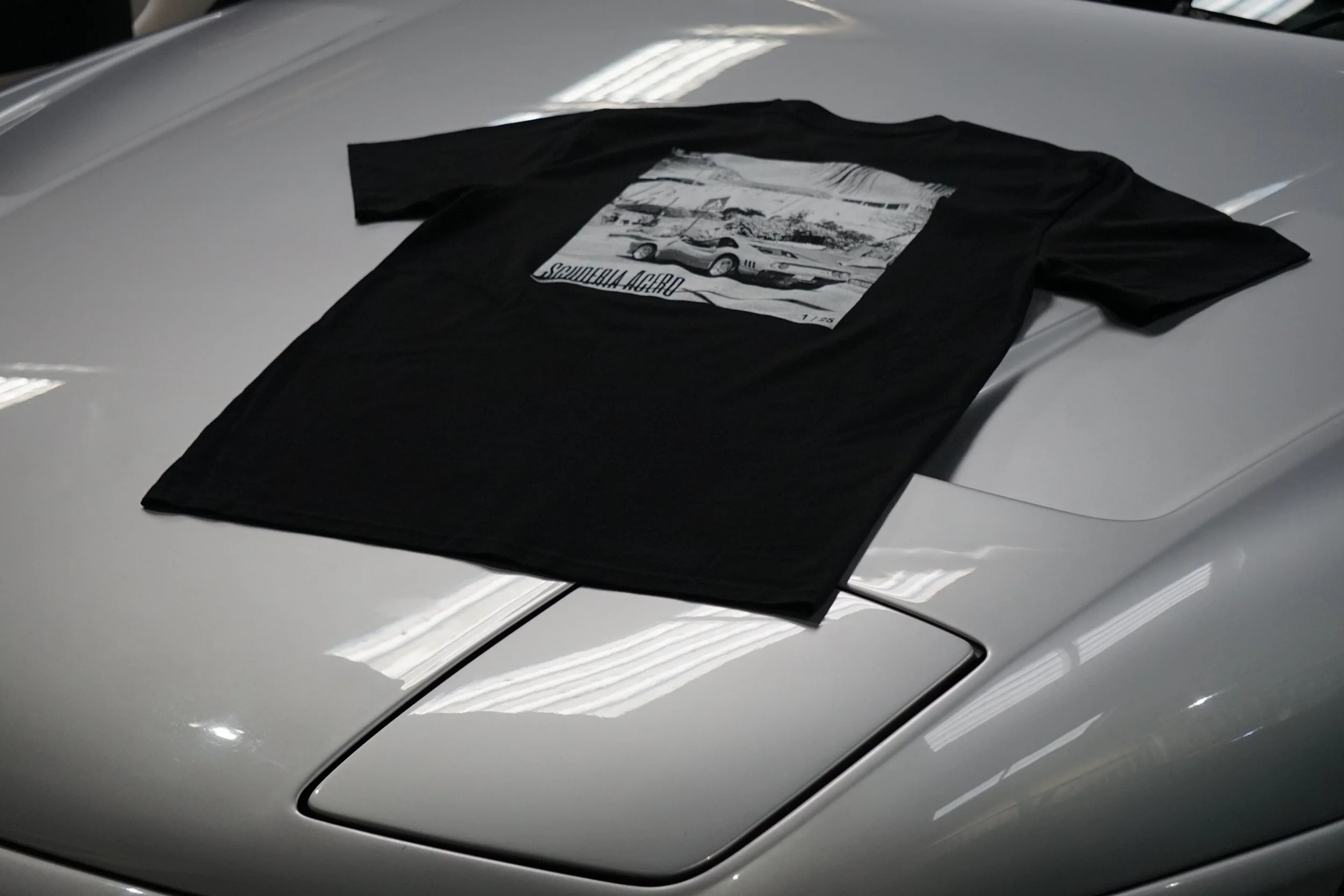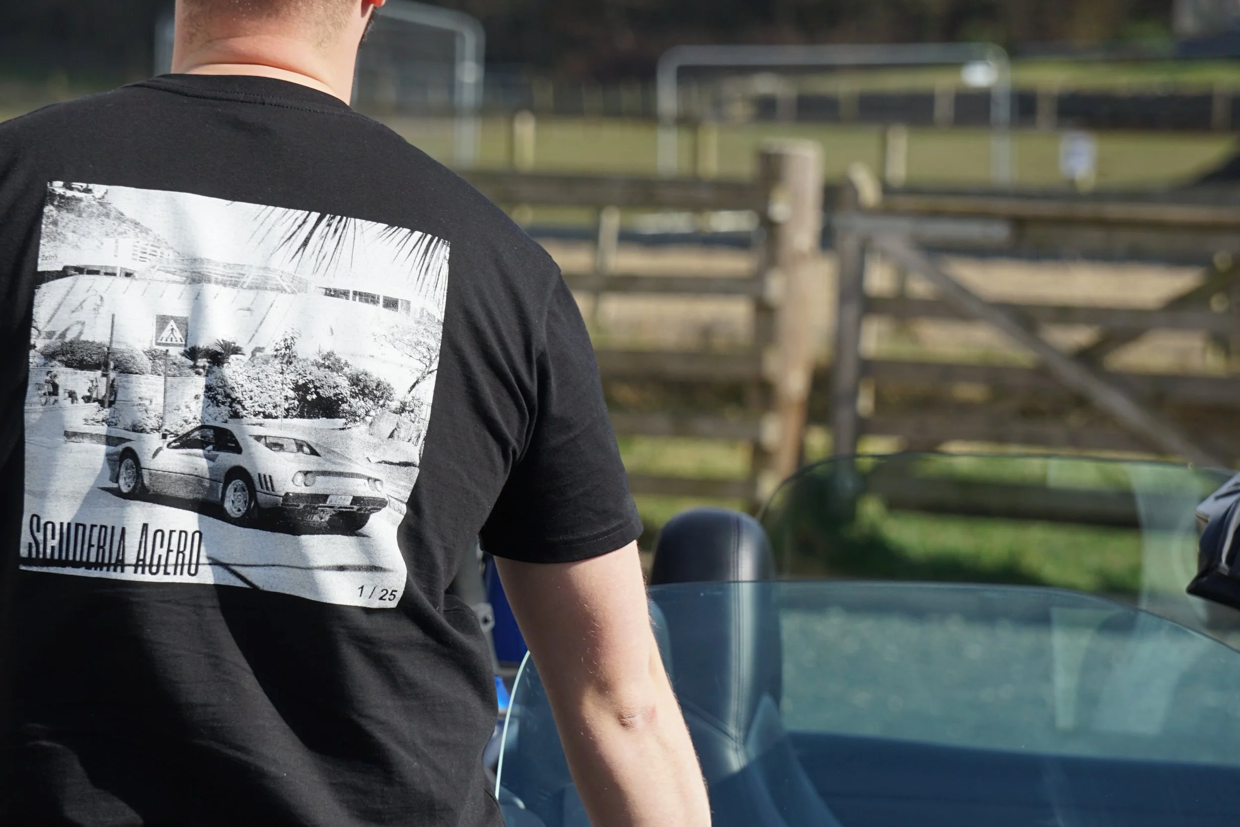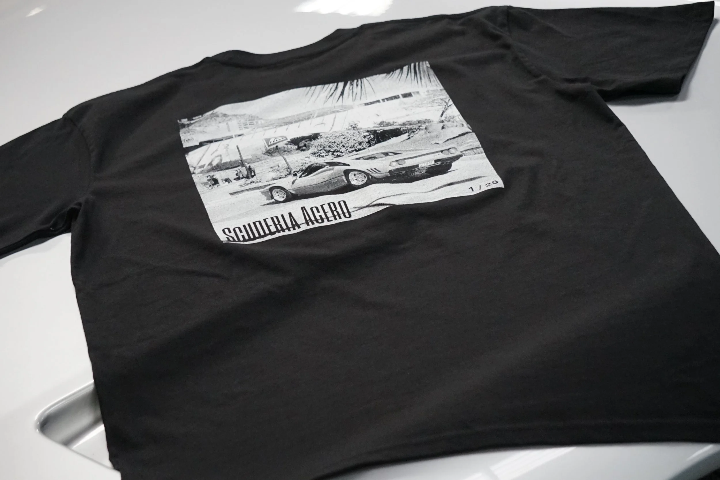 Italian automotive lifestyle clothing by Scuderia Acero - Our extremely limited edition T-Shirts come in batches of only 25, and each batch features a unique Italian automotive print on the rear from photo’s taken during automotive adventures by Maple House Classic Cars.